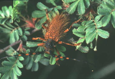 长毛天牛 Arctolamia vilposa Gestro 英文名:longhorn beetle 属于鞘翅目 Coleoptera 天牛科 Cerambycidae。 成虫体长:22-34毫米;体宽:7-11毫米。 身体十分宽厚,黑色,大部被泥*细毛。天牛科是鞘翅目中很大的一个类群,是植物的钻蛀性害虫,林、果、桑、茶、棉、麻、蔗、药材、花卉、瓜蔓、竹、木建筑材料、家具以及商品包装等都可受各种天牛为害。我国东洋界的天牛种类极其繁荣,长毛天牛就是这一区典型的代表性种类之一,其向北分布的界限一般不越过贵州中部。 寄主:不详 分布:云南、缅甸。