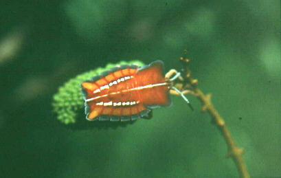 荔蝽 Tessaratoma quadrata Distant 英文名:lychee stink bug 属于半翅目 Hemiptera 蝽科 Pentatomidae。 是荔枝、龙眼的主要害虫,常年减产20-30%,大发生年份则达80-90%。还为害柑橘、梅、梨、桃、橄榄、香蕉等果树。成虫和若虫吸食花、幼果和嫩梢的汁液,造成落在落果,甚至枯死,尤为幼果结成30天内最为严重。荔蝽分泌的臭液有腐蚀作用,能使花蕊枯死,果皮发黑,影响质量,并能损害人的眼睛及皮肤。若虫的为害有时比成虫更烈。 成虫体长21-31毫米,宽11-17毫米。三龄若虫体长10-12毫米。 分布:福建、江西、广东、广西、贵州、云南、台湾;菲律宾,越南、缅甸,印度,泰国,马来西亚,斯里兰卡,印度尼西亚。