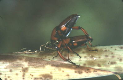 直锥象 Cyrtorachelus Longimanus Fabricius 英文名:snout beetle 属于鞘翅目 Coleoptera 象虫科 Curculionidae。 体长18-35毫米,宽9-15毫米。体菱形,红褐色至褐色,光滑,无鳞片。本种为竹笋重要害虫,成虫咬食嫩笋作为补充营养,雌虫产卵前在竹笋上咬出小洞,产卵于洞中,一笋一卵。 幼虫孵化后咬食竹笋。以成虫在土中越冬。成虫飞翔力很强,平时停于笋、竹叶或杂草上。足受震动时会假死,自高处震落,至半空中时往往飞去。 寄主:青皮竹、粉单竹。 分布:江苏、浙江、湖南、福建、台湾、广东、广西、四川、云南;印度、缅甸,锡金,柬埔寨,越南,印度尼西亚,日本,菲律宾。