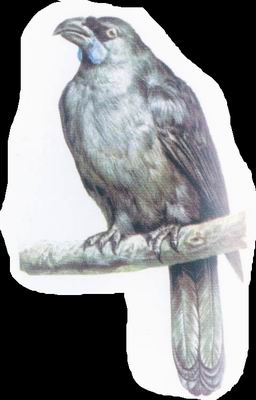 垂耳鸦因其嘴基部有一对下垂肉而得名,垂耳鸦和新西兰椋鸟一样生活在新西兰北部岛屿的茂密森林里。它的叫声和新西兰椋鸟完全不同,是那种令人听了毛骨悚然的“哇、哇”叫声。垂耳鸦的身长约0.38 m,其中长长的的尾巴占身长的近一半。它们全身的羽毛为灰黑色,腹部比背部要稍浅一些。垂耳鸦最显著的特征是它们和新西兰椋鸟一样雌雄间长的羽毛颜色形成鲜明对比的开蓝色肉垂。