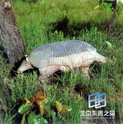 大犰狳又被叫做巨犰狳或者王犰狳,是犰狳中体型最大的一种,体色黑褐,体长为75—100厘米,尾长约50厘米,体重60千克。在它的头顶上被有鳞片,就像戴着一付头盔,两侧长着一对圆形的小耳朵,嘴巴尖而长,口中生有100多颗同型的牙齿,超过一般哺乳动物数倍之多,但这些牙齿均弱小而无力,并且缺少门齿和犬齿,不能进行自卫,老年以后逐渐脱落。身体可以分为前、中、后三段,外面都被有一层由小骨片组成的、如瓷砖般排列的骨质鳞片,如同硬甲一般保护着身体,前段和后段的骨质鳞片连成像乌龟壳一样的整块结构,不能伸缩,中段的鳞片呈条带状环绕而形成“绊”,有筋肉相连,其中3—4条在颈部,11—13条在背部,可以自由伸缩,从而增加了身体的灵活性,甚至可以快速奔跑。拖在身后的长长的尾巴和四肢上也均有鳞甲,鳞片之间长有稀疏而粗糙的毛。腹部没有鳞,生长着较为浓密的毛。它的四肢十分粗壮,趾上的爪尖锐而强硬,十分有力,其中第三爪较为弯曲,全长20厘米左右,但只适于挖掘而不适于与天敌搏斗。