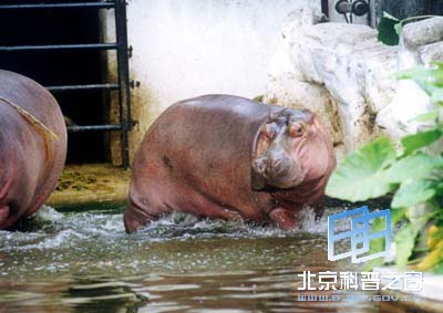 河马从名字上讲应该是“河中的马”,但它的外形看起来并不像马,倒略似一只特别大的猪,而且在进化过程中也与猪类的亲缘关系更为接近,所以管它叫“河猪”似乎更为合适。它是陆地上仅次于象的第二大哺乳动物,体躯庞大而拙笨,体长为350—450厘米,尾长约56厘米,体重3000—3500千克,但比较矮,四肢特别短,肩高只有140一165厘米,还不及象的一半高。有一个粗硕的头和一张特别大的嘴,比陆地上任何一种动物的嘴都大,并且足可以张开呈90度角。嘴里的牙也很大,门齿和犬齿均呈獠牙状,是进攻的主要武器,下门齿不是向上生长,而是像铲子一样向前面平行伸出,长度可达60一70厘米,重量为2一3千克,犬齿的长度也达75厘米左右。眼睛、鼻孔、耳壳等都生在面部的上端,几乎在同一个平面上。皮肤很厚,背部和两侧的厚度可达4一5厘米,呈黑褐色兼赤紫色,光滑无毛,仅在嘴端、耳内侧和尾巴上有一些毛。前后肢上各有大小几乎相等的4趾,趾尖有蹄,其形状如同扁爪,趾间略微有蹼。