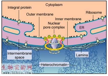 外核膜胞质面附有核糖体,并与内质网相连,核周隙与内质网腔相通,可以说是内质网的一部分。外核膜上附着10nm的中间纤维intermediate filament,可见核是被内质网和中间纤维相对固定的。