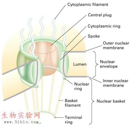 在电镜下观察,核孔是呈圆形或八角形(图12-4、5),一般认为其结构如fish-trap,主要包括以下几个部分:①胞质环(cytoplasmic ring),位于核孔复合体胞质一侧,环上有8条纤维伸向胞质;②核质环(nuclear ring),位于核孔复合体核质一侧,上面伸出8条纤维,纤维端部与端环相连,构成笼子状的结构;③转运器(transporter),核孔中央的一个栓状的中央颗粒;④辐(Spoke):核孔边缘伸向核孔中央的突出物(图12-6)。