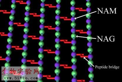 细胞壁厚度因细菌不同而异,一般为15-30nm。主要成分是肽聚糖,由N-乙酰葡糖胺和N-乙酰胞壁酸构成双糖单元,以β(1-4)糖苷键连接成大分子。N-乙酰胞壁酸分子上有四肽侧链,相邻聚糖纤维之间的短肽通过肽桥(革兰氏阳性菌)或肽键(革兰氏阴性菌)桥接起来(图3-10),形成了肽聚糖片层,像胶合板一样,粘合成多层。