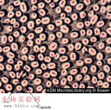 图3-12 一种细菌的负染照片,显示荚膜 图片来自http://www.microbelibrary.org