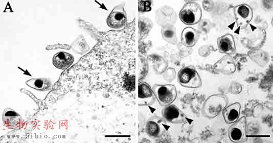 图3-18 衣原体Chlamydia pneumoniae 梨子形的原体(EBs),左、吸附在巨噬细胞表面,右、进入细胞内部的原体,图片来自iwww.bioscience.org/2002/ v7/e/hahn/figures.htm