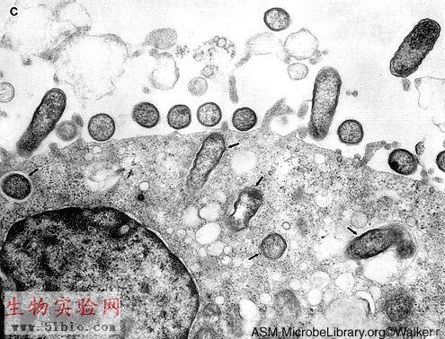 图3-19 附着在内皮细胞表面的立克次氏体和细胞内包含立克次氏体的内吞体 图片来自http://www.microbelibrary.org