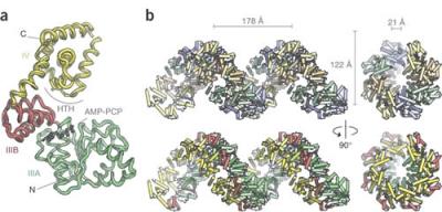 关于蛋白质结晶学,伯克利高级光学实验室透露当脱氧核糖核酸(DNA)与三磷酸腺甙(ATP)结合在一起时,环形AAA+结构的蛋白质就会聚集进一个右旋螺旋结构中。