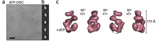 ORC的电子显微图像(起始可识别复杂体)在黑腹果蝇细胞中展现的当ORC与ATP结合时产生的螺旋结构变形。
