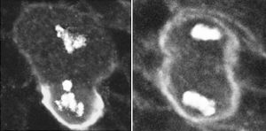 左图:正常分裂的成神经细胞创造出一个大的子细胞和一个将成为部分神经的小细胞。