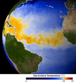 图中*和橙色部分显示了2003年夏季飓风形成的热带水域。非洲在右方,南美洲在左下方,美国东海岸在左上方。