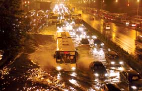 ▲一场暴雨,几乎影响了北京全市各交通主干道的“防线”,二环路多处拥堵,三环路航天桥等处的车居然成了“船”,飘在水面。初步统计,全市积水路面高达41处,交管部门认为主因为排水不畅。