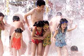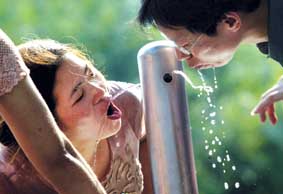 ▲日前,杭州市的最高气温已超过了摄氏37度,公共场所的自动饮水机也“热”了起来,不时有渴极的游客过来狂饮一番。