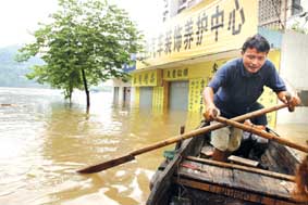 ▲七月二十日广西柳州市上游地区连降大到暴雨柳江水位骤然上涨街面已经被洪水漫过柳州市防汛抗旱指挥部相继发出二零零四年第一号第二号水情公告要求各城区防洪办公室迅速组织力量转移江面无动力船舶并全天开动广播船预报水情动员低洼地段居民提前转移