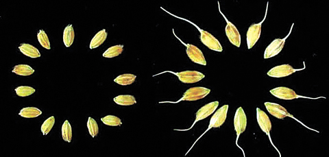 杨金水教授说,小麦、高粱、玉米等其他谷类作物都有RRM1结构域,与水稻RRM1的顺序基本相同。在其他谷类作物上进行同一实验,可望获得类似的结果。这一发现可为谷类作物的产量性状改良提供重要技术储备。导入RRM1基因片段的粳稻,其穗子(上图)、芽(中图)、谷粒(下图)较左边的对照组明显增大。