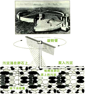 该系统是一种简单且相对便宜的膜式好氧处理装置。在该处理系统中,通过转动的栅栏喷淋装置将污水均匀分布于多孔处理床(例如由石子等铺成)上。