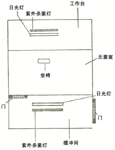 无菌室一般是在微生物实验室内专辟一个小房间。可以用板材和玻璃建造。面积不宜过大,约4—5平方米即可,高2.5米左右。无菌室外要设一个缓冲间,缓冲间的门和无菌室的门不要朝向同一方向,以免气流带进杂菌。门多用推拉式,便于快速启闭。无菌室和缓冲间都必须密闭。室内装备的换气设备必须