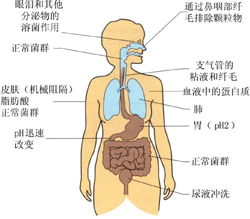 人体对微生物的入侵和繁殖并不是听之任之的。当一种微生物侵入宿主并大量繁殖时,宿主自身的生物防御功能会被激发,事实上人体对微生物的入侵至少有4道防线。第一道防线是宿主的皮肤和粘膜,它们除可以作为一道机械的屏障外,皮肤上的汗腺、皮脂腺,胃和鼻腔粘膜以及唾液、眼泪中都含有一种称为溶菌酶的物质,能够溶解许多细菌,同时,生活在皮肤上的一些正常菌群产生的物质也可以在一定程度上抑制某些致病菌的生长,例如有种丙酸杆菌产生的脂类化合物可以抑制金*葡萄球菌和酿脓链球菌的生长。第二道防线是一组统称为干扰素的物质,它是由被病毒感染的细胞产生的干扰病毒生长的蛋白质。第三道防线是血液中存在的白细胞,它很象变形虫,其中一些称作巨噬细胞,可以吞噬并消化任何外来的微生物,还能够在免疫反应中起协同作用,即使一个小伤口也会吸引这些巨噬