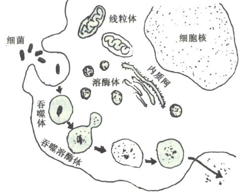 以病原菌为例,吞噬、杀菌过程分为三个阶段,即吞噬细胞和病菌接触、吞入病菌、杀死和破坏病原菌。吞噬细胞内含有溶酶体,其中的溶菌酶、髓过