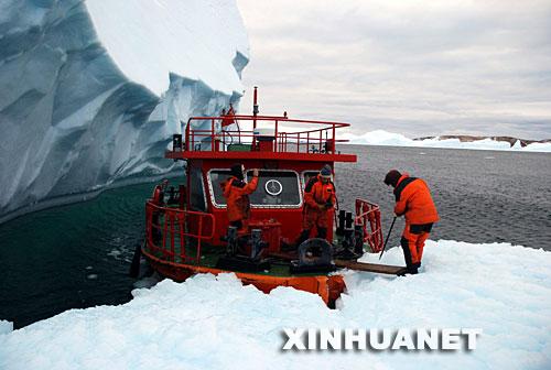 3月8日,我国第24次南极科学考察队员乘坐小艇来到冰山上。(新华社记者 张建松 摄)