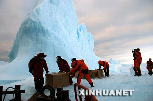 3月8日傍晚,我国第24次南极科学考察队员将采集的冰芯样品运上小艇。(新华社记者 张建松 摄)