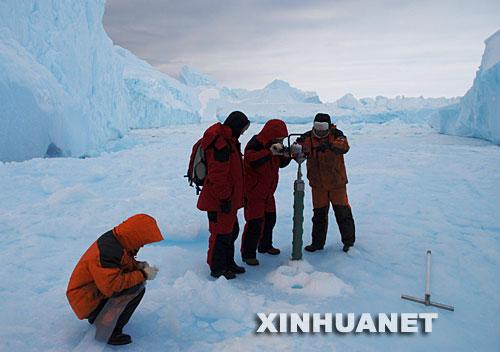 3月8日傍晚,我国第24次南极科学考察队员在冰山上采集冰芯样品。