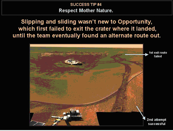 原地打滑转圈对“机遇”号来说已是家常便饭了。它第一次尝试开出着陆点所在的陨石坑就失败了(图中上方箭头所示),直到科学家最终找到了一条备选的线路(图中下方箭头所示)才得以脱身。