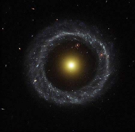 霍格天体是由年轻的蓝色恒星组成近乎完美的圆环,环绕在核心的年老黄色恒星的环星系位于巨蛇座,距离大约6亿光年远,比我们的银河系稍微大一点。分隔两种恒星集团的空隙可能有星团存在着,但可能因为太暗而看不见。这是一种罕见的星系类型,在中间的核心和圆环间空隙的一点钟方向上,还能看见另一个更遥远的星系。