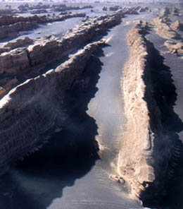 在中国内陆荒漠里,有一种奇特的地理景观,它是一列列断断续续延伸的长条形土墩与凹地沟槽间隔分布的地貌组合,被称为雅丹地貌。20世纪初中外学者进行罗布泊联合考察时,在罗布泊西北部的古楼兰附近发现这种奇特的地貌,并根据维族人对此的称呼来命名,再译回中文就成了“雅丹”。