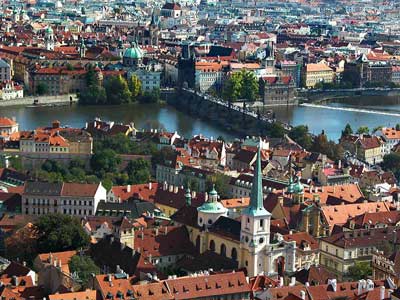 捷克首都布拉格(Prague),位于国境西部,座落在拉贝河支流伏尔塔瓦河两岸,人口121万,是一座美丽而古老的山城。伏尔塔瓦河像一条绿色的玉带,将城市分为两部分,沿河两岸陡立的山壁,渐渐消失在远方起伏的原野里。横跨在河上的10几座古老的和现代化的大桥,雄伟壮观,将城市两部分协调巧妙地联为一体。耸立在市区的伯特日娜山,乔木葱郁,风景秀丽,是一处环境幽雅的休息之地。