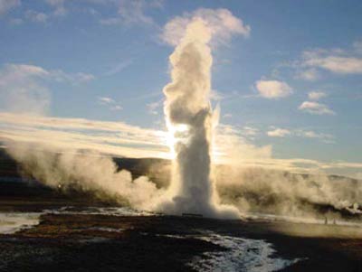 斯特罗克尔间歇泉 斯特罗克尔间歇泉位于冰岛西南部,首都雷克雅未克以东约80千米处。每小时喷射几次,每次持续约4~10分钟。 每当喷射时,滚烫的水通过直径约3米的水塘里的一个洞口涌出,呈一蓝绿色的水穹。然后,伴随着一阵轰鸣声,气泡翻腾,一股沸水柱猛地冲向22米以上的空中。蒸气弥漫,发出嘶嘶声。然后喷水逐渐平息下来,直到下一次喷发。