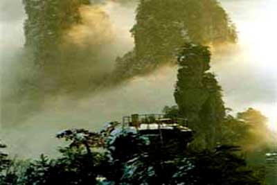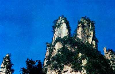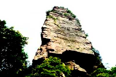 这座塔式岩峰,上部裂成两瓣,似被右侧状如利斧的岩峰所劈。游人至此,会联想起“劈山救母”的神话。