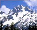 玉龙雪山主峰扇子陡海拔5596米,直插蓝天。南北向排列的玉龙十三峰犹如一条腾空的巨龙,不仅气势磅礴,而且秀丽挺拔,造型玲珑,还随着时令和阴晴的交替变幻无常。它时而云蒸雾涌,玉龙乍隐乍现,时而碧天如水、万里无云,群峰像玉液刷洗,银光耀目;有时一条云带束腰,上面雪峰皑皑,下面岗峦碧翠。东方欲晓,峰顶早染晨曦,多彩的朝霞映上雪峰,白雪呈绯红状与霞光掩映闪烁;傍晚余辉把雪峰染抹得象披上红纱,云朵带着晚霞奇彩,飞归峰间谷壑,一弹之顷,变态无穷。