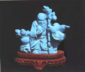 绿松石 绿松石的英文名称为Turquoise,意思是“土耳其石”,又称“土耳其玉”。其实土耳其并不产绿松石,之所以被冠以此名,大概是因为古代波斯产的绿松石最初是途经土耳其运往欧洲的缘故。绿松石因形似松球,色近松绿而得名。工艺名为松石。 绿松石是含水的铜、铝的磷酸盐矿物,化学分子式为CuAl6(PO4)4(OH)8·5H2O。属三斜晶系。晶体形态呈致密的隐晶质集合体,有时呈皮壳状、结核状,单个晶体极为罕见。颜色多呈天蓝色、淡蓝色、绿蓝色、绿色、带绿的苍白色。玻璃光泽至油脂光泽,条痕白色,不透明。折光率1.62,双折射率0.040,多色性弱。硬度5~6,密度2.6~2.9g/cm3。无解理,断口平坦状,有时呈贝壳状。质地十分细腻,韧性相对较差。