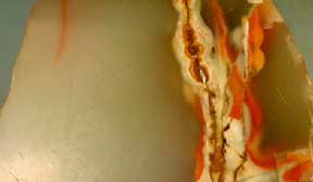条纹大理岩 条纹大理岩化学组成CaCO3 ,CaO 56.03%,CO2 43.97%。常含有锰和铁;鉴定特征可以从硬度3、菱形的解理、浅色、玻璃光泽和与冷稀HCl相遇剧烈气泡遇,予以鉴定。亦可以作钙的试验。它和白云石很类似,而且共生在一起。不过白云石要在热的盐酸中,才有显著的气泡反应。它和霰石不同之处是比霰石轻,霰石的比重是2.9~5;系由碳酸钙水溶液沉淀而成,常呈巨厚状产于沉积岩中。