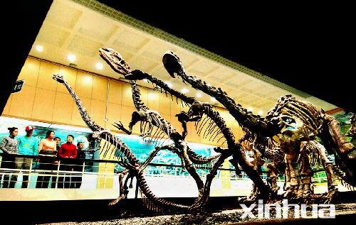 游客在云南省禄丰县恐龙博物馆观看由原蜥脚类、蜥脚类、肉食龙、植食龙等恐龙骨骼化石组成的“龙群”(11月20日摄)。 “恐龙之乡”云南禄丰县距昆明市97公里,是中国迄今为止发现恐龙属、种和数量较多的地区之一。从1938年至今,在该县大洼山、五台山、大立树后山等60平方公里的范围内共发掘出10属12种恐龙骨骼化石140余具。如今,禄丰县已成为中外专家研究恐龙出现、进化的理想之地。每年有逾12万名