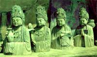 丰富,可与敦煌莫高窟、云冈石窟、龙门石窟齐名。 大足石刻因地处中国内地山区,过去交通不便,幸免了历代战争的浩劫和人为破坏,具有很高的文物、雕刻和旅游价值,尤以北山摩崖石刻和宝顶山摩崖石刻最集中。 北山摩崖(石窟)石刻位于大足县城北两千米处,开凿于唐代昭宗景福元年(892年),历经五代,两宋,相继在佛湾、营盘坡、观音坡、北塔寺、佛耳岩等处造像近万躯。长达500米余,共编为290号龛窟。其中有碑碣6通,题记和造像55处,经幢8座,银刻线阁1幅,石刻造像364龛窟。 北山石刻以佛湾造像最为集中,共编290号龛窟。在长300多米、高7米的崖壁上,有碑碣6通,题记和造像铭记55则,经幢8座,阴刻“文殊师利问疾图”一幅,石刻造像264龛窟。佛湾佛像雕刻精细,体态俊逸,风格独特。“心神车窟”中的“普贤菩萨”造像精美,被誉为“东方维纳斯”;“转轮藏经洞”被称为“石雕宫阙”;“韦君靖碑”、“蔡京碑”、“古文孝经碑”为世所独存,既是书法珍品,又可补史料之遗缺,价值极高。佛湾石刻分南北两个区域,南区大多是晚唐、五代作品,北区大多为两宋时期作品。晚唐时期的作品,人物造型端庄丰满、气质浑厚、衣饰简朴、线条流畅。五代时期的作品,玲珑精巧、多彩多姿,衣着服饰由简到繁,逐渐摆脱了外来文化影响,具有石刻造像过渡期的特征。两宋时期的作品,民族特色已十分突出。 宝顶山摩崖(石窟)石刻距大足县城东北15千米,石刻创始人为宋蜀中名僧赵智凤,建于南宋淳熙六年至淳祐九年(1179—1249年),历时70多年,石刻共13处,造像数以万计,以大佛湾和小佛湾规模最大。宝顶山是佛教圣地之一,有“上朝峨嵋,下朝宝顶”之说。 大佛湾为幽深的马蹄形山湾,雕刻分布在东、南、北三面,先以小佛湾为蓝图,后在此雕造。由19组佛经故事组成的大型群雕,各种雕像达15O00多躯,设计之精巧,竟无一雷同,破了“千佛一面”之说。宝顶圆觉洞,为整石开凿,宽敞如室。洞正壁刻佛像三尊,主佛前有跪菩萨一尊,俯首合十,恭敬虔诚,左右壁为十二圆觉菩萨,跌坐莲台,妙丽庄严,姿态不一,衣服、肌肉质感真实,似薄纱突身,衣裙流畅自如。壁间刻楼台亭阁,人物鸟兽,花草树木,幽泉怪石,近似写实作品,是大佛湾雕刻的精华。巨型雕有30多幅,著名的有:六道轮回、广大宝楼阁、华严三圣像、千手观音像、释迦涅槃圣迹图、九龙浴太子、孔崔明石经变、毗卢道场、父母恩重经变像、大方便佛报恩经变像、六耗图、地狱变像等,以佛经故事为主要题材,造像旁还刻有经文、颂词等文字说明,宛如一幅幅图文并茂的连环图画,是不同于中国其他石窟的显著特点。 大足石刻不仅有规模巨大的佛教造像和体系完整的道教造像,还有石窟造像中罕见的纯儒家造像,而且“三教”、“两教”合一的雕刻也很多。大足石刻的这种文化现象作为实物例证,反映出在中国文化史上儒、道、释三家长期以来既斗争又融合,到宋代时“孔、老、释迦皆至圣”,“惩恶助善,同归于治,三教皆可通行”的“三教合流”思想占主导地位的局面已经巩固。 大足石刻,“凡佛典所载,无不备列”,在艺术上“神的人化与人的神化”达到高度统一。 大足石刻纵贯千余载,横融佛道儒,造像精美,完好率高。同时伴随造像出现的各种经文、傍题、颂词、记事等石刻铭文有15万余字,而且多为金石史中的佳品,是一座难得的文化艺术宝库。具有鲜明的民族特色,具有很高的历史、科学和艺术价值,在我国古代石窟艺术史上占有举足轻重的地位,被国内外誉为神奇的东方艺术明珠,是天才的艺术,是一座独具特色的世界文化遗产的宝库。