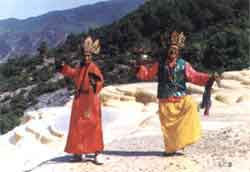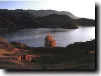 另一条是从丽江城西行至滇藏公路,过金沙江大桥,经中甸县虎跳峡镇,转进峡中。从上峡口看玉龙山巅,转进峡中。从上峡口看玉龙山巅,酷肖天国城垛。江面平缓,像柔静少女,但一入峡口使激浪滔天,变成暴戾的怒汉了。先到上虎跳,一道铁瀑高坎最为惹目。坎两侧,绝壁擎天,构成两扇巨型石门,当中屹立着三角状的虎跳石,金沙江巨流从此夺路而出,跃过高坎,以雷霆万钧之势摔砸下来,高坎下,千波万涛沸沸扬扬,回旋翻滚。看那场面,令人心惊胆战。往前,不久见到“满天星滩”滩长半里,暗礁棋布,掀起满江银浪,涛声震天,看似奶河繁星,故而得名。全峡有这样的险滩18个,平均不到一里便有一滩。到大峡中段阿昌谷,核桃园村有简易旋舍供食宿。数十户人家的房屋那用青石板砌盖,山地像一幅幅地图挂在墙上。离村往江边走,就到特险特奇的中虎跳了。只见獠礁林立,危崖四耸,遮天摩云,嵯峨的虎跳石如鬼怪戏浪。激流撞礁,晶花腾空,惊涛轰鸣,如雷贯耳。盖江崖头乱泉涌流,拦腰有一条半里磴道,人行当中,泉水从头顶喷泻而过,织成一挂挂奇丽的珠帘,别有洞天。此外在虎跳峡沿江的岩壁上,发现了12个珍贵的古岩画鱼,使这条世界大峡谷又添奇观。