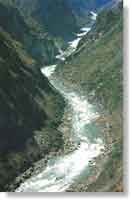 虎跳峡,又称“金沙劈流”,距丽江县城60公里,位于玉龙雪山与哈巴雪山之间,两山夹峙成一座大峡谷,金沙江穿峡而过,江面险窄,最窄处仅有30米,相传老虎能一跃过江,故称“虎跳峡”。全峡长约16公里,高差3900米,全长分上虎跳、中虎跳、下虎跳三段,有18个险滩错落排列在峡谷中,浪涛翻卷,胜过著名的美国科罗拉多大峡谷。为世界最深的峡谷之一。