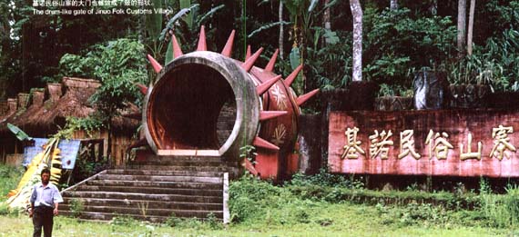 告别了资切站长,我们驱车来到基诺民俗村。在民俗村里,还能看到大庭及里面的五柱。民俗村建在高高的山上,由此也可以看出基诺民族是山上的民族。进了深山,这个民族就充满了活力,于是他们的文化也就最终保留在了高山之上。