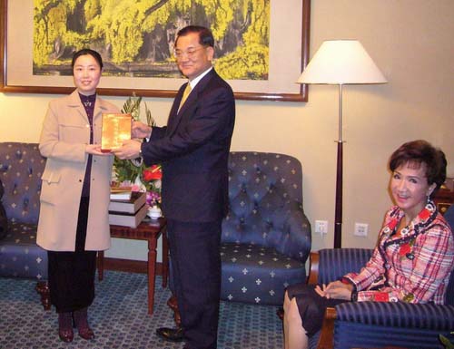 下午的阳光照耀着小会客室,我向连战主席夫妇依依道别。他们谆谆儒雅的长者风度和博学友善、春风和煦的谈吐,使我心中漾满了温馨而愉快的记忆。