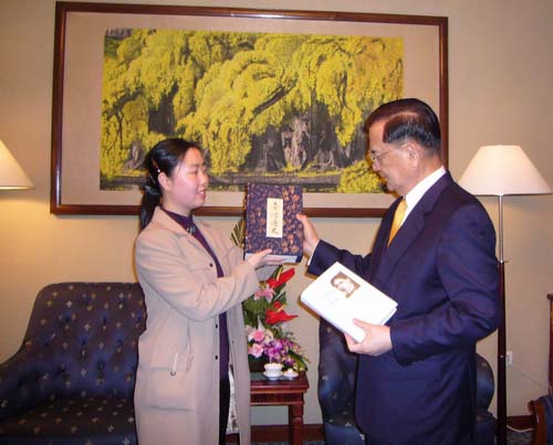 谈话气氛越来越热烈,连战主席起身又回赠了我两套书。一套是在台湾出版的仿古精装本,他的先祖父、著名史学家连横先生的著作《台湾通史》;一本是美国密西西比大学历史教授吴淑惠2005年出版的英文版《连横》研究。夫妇二人当场为两套书分别签名。此前,据说凤凰卫视曾报道,这两套书是连荣誉主席此次大陆之行带来的仅有的两套,但究竟送给谁还是个谜。我接过连主席手中的两套书,心情是无法形容的激动。连横先生在日据时期书写青山青史,《台湾通史》始终是我十年来的最敬。今天捧着这套由连战主席亲手赠送的厚重著作,感到连横先生的热血风骨再次注入心中。连战主席第一次大陆之行,曾把这套《台湾通史》赠送给北京大学。我是大陆有此殊荣的唯一作家,作为作家我是幸运的。连战荣誉主席还回赠了三本夫妇二人的著作,一本是连方瑀女士的著作《半世纪的相逢》;两本是连战主席的著作:《改变,才有希望》,《连战的主张》。这三本著作一起装帧在精美的亮红色书匣中,书匣封面竖版印有“相逢自是有缘”几个字,落款是荣誉主席连战和夫人连方瑀女士的名字。据说,这种装帧精美的礼品书,连战荣誉主席此行只带了20套。我和连主席夫妇手捧赠书,再次合影留念。