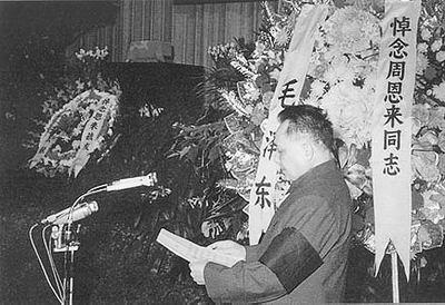 追悼会,邓小平致悼词,追悼会是比预定时间晚了十好几分钟开,我们都在那里静站着是,别人怎么样想,我不知道,我当时候想的时候,我说是不是等毛主席来呀,是吧,因为陈毅逝世的时候,毛主席突然去了,在这意料之外的,那么总理逝世,这么好的战友,这么,毛主席是不是来啊,是不是有意地等毛主席来,谁都不说,等了十几分钟以后没有动静,以后了才知道,那时候毛主席根本不能动了,根本不能动了,但是人们的心里都在那里盼。