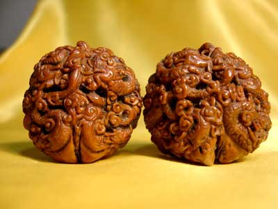 张品超介绍,可以用来当作手球的山核桃,不宜过大过小,形体周正,“成对儿”性强;其次是棱不宜过高、过宽,纹不宜过细、过碎。整体谐美,便于揉转。这是就外观而言。深一点儿再论,就是说到内质问题,也就是外皮。宜厚不宜薄,宜坚不宜松。质润色红、有数十年“服役”期的老核桃手球,是难得的精品。