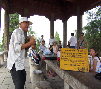 人民网8月28日电 今天,在水泊梁山风景区,68岁的民间老艺人邱忠堂用源于明代的“莲花落”说唱水浒故事,深受游客欢迎。莲花落,明代始流行于鲁西南等地区,现在已经濒临失传。(潘瑞津