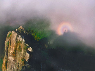 至今青城山上清官旁还有神灯亭,所谓的神灯就出现在对面的大面山。如果登临峨眉山金顶,幸运的人能看到舍身崖下的圣灯;庐山观佛灯的地点在大天池旁的文殊台。这些地方偶遇月隐之夜,山下黑漆漆的幽谷间,会倏然涌现荧荧亮光。亮光时大时小,时聚时散,忽明忽灭,忽左忽右,或近或远,好像—盏盏灯笼。“灯”的颜色是白色或青色,有的时候微带绿色。僧道们都说这是过路的神佛手提灯笼穿行在天地之间。