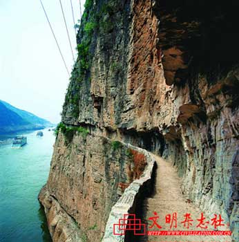 三峡栈道大多是在高出江面数十米的临江峭壁上开凿的。施工之时“工匠无从凭借,皆对壁凿孔,层垒而上。每开一洞,实以火药,燃引线以炸之,旋炸旋凿”