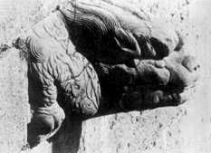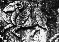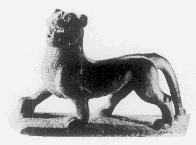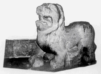 中国古代动物雕刻艺术成就较为集中地反映于历代陵墓石雕瑞兽作品中。保存到现在的历代作品为数众多。为我们探求石雕艺术的发展提供了丰富的实物资料。陵墓雕刻的初兴,可追溯到秦或更早的年代。西汉霍去病墓的大型动物石雕,为西汉时期的代表作。它突破了陵墓雕刻的格式局限,表现雄健浑朴的风格,艺术手法有高度的概括性。东汉武氏祠石狮一对,为我国陵墓石狮造型的最早作品,形态逼真,鬣毛清晰可见(图三二)。