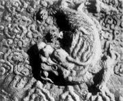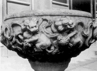 狮子本不是中国土生的动物。相传到东汉,西域琉勒国才送来第一头狮子。古人以狮子为「百兽之王」,可镇百兽,能辟邪护法。传说佛祖释迦牟尼诞生时,一手指天,一手指地,作狮子吼云:「天上天下唯我独尊。」从此狮子被逐渐神化,成为佛法威力的象征,狮子还常成为菩萨的坐骑(图四一)。 图四一